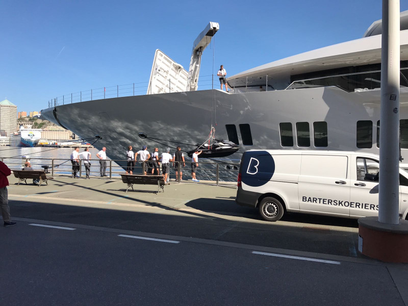 In Keulen werd er gewerkt met een lichte aanhanger die aan de bus werd gekoppeld om de waterscooters te vervoeren. De waterscooters zijn vervolgens aan de kade bij het schip in Genua afgeleverd en op het schip getakeld.